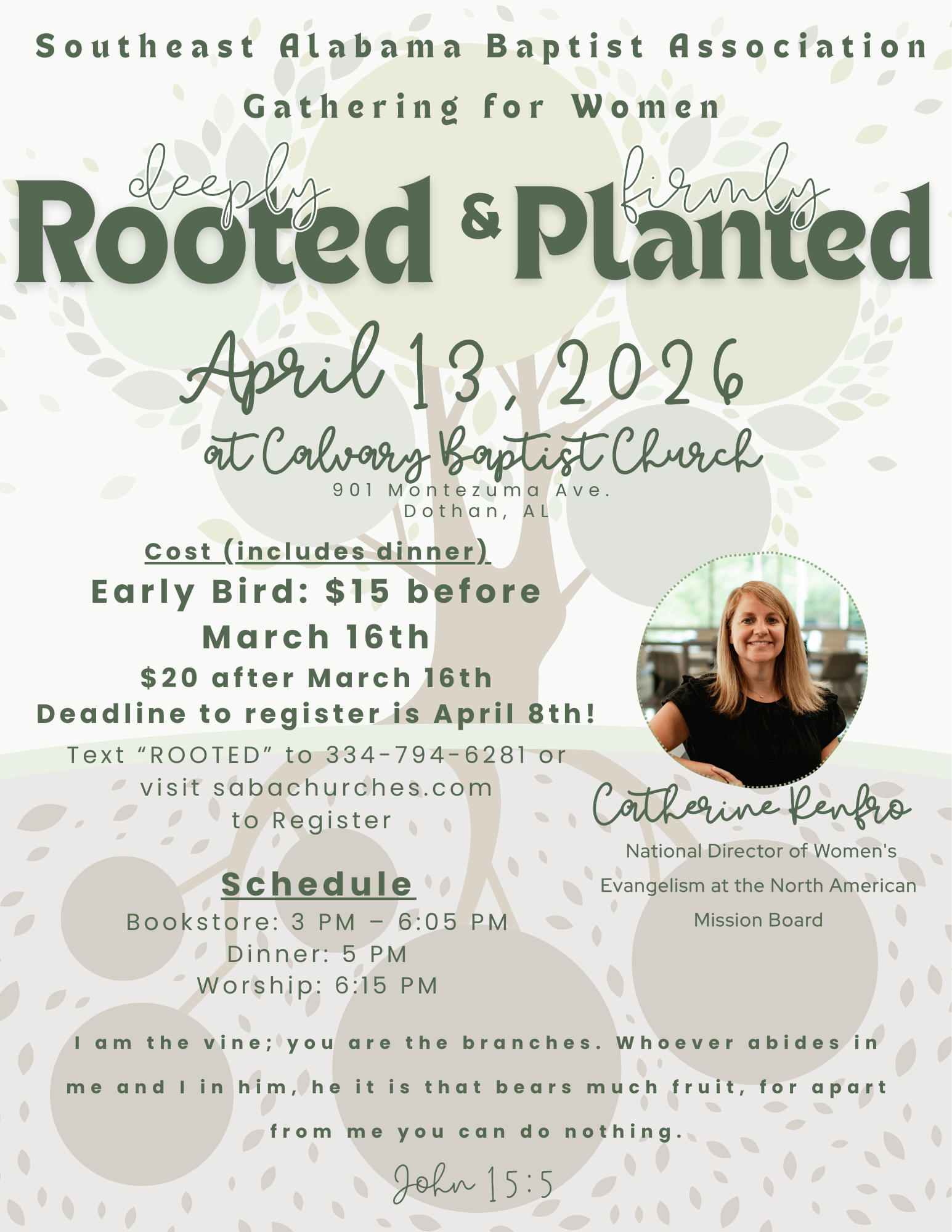 This year’s gathering is designed to encourage women to be rooted deeply in Christ and His Word and to be planted where God has placed them—living faithful, fruitful lives for His glory. Drawing from John 15, our focus will be on what it means to abide in Christ and flourish with the gospel right where we are.